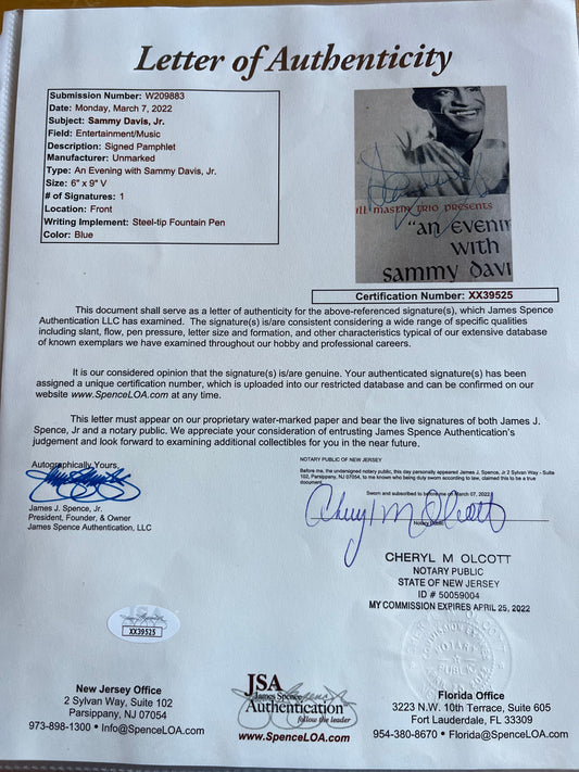 SAMMY DAVIS, JR., signed pamphlet with Letter of Authenticity, autograph