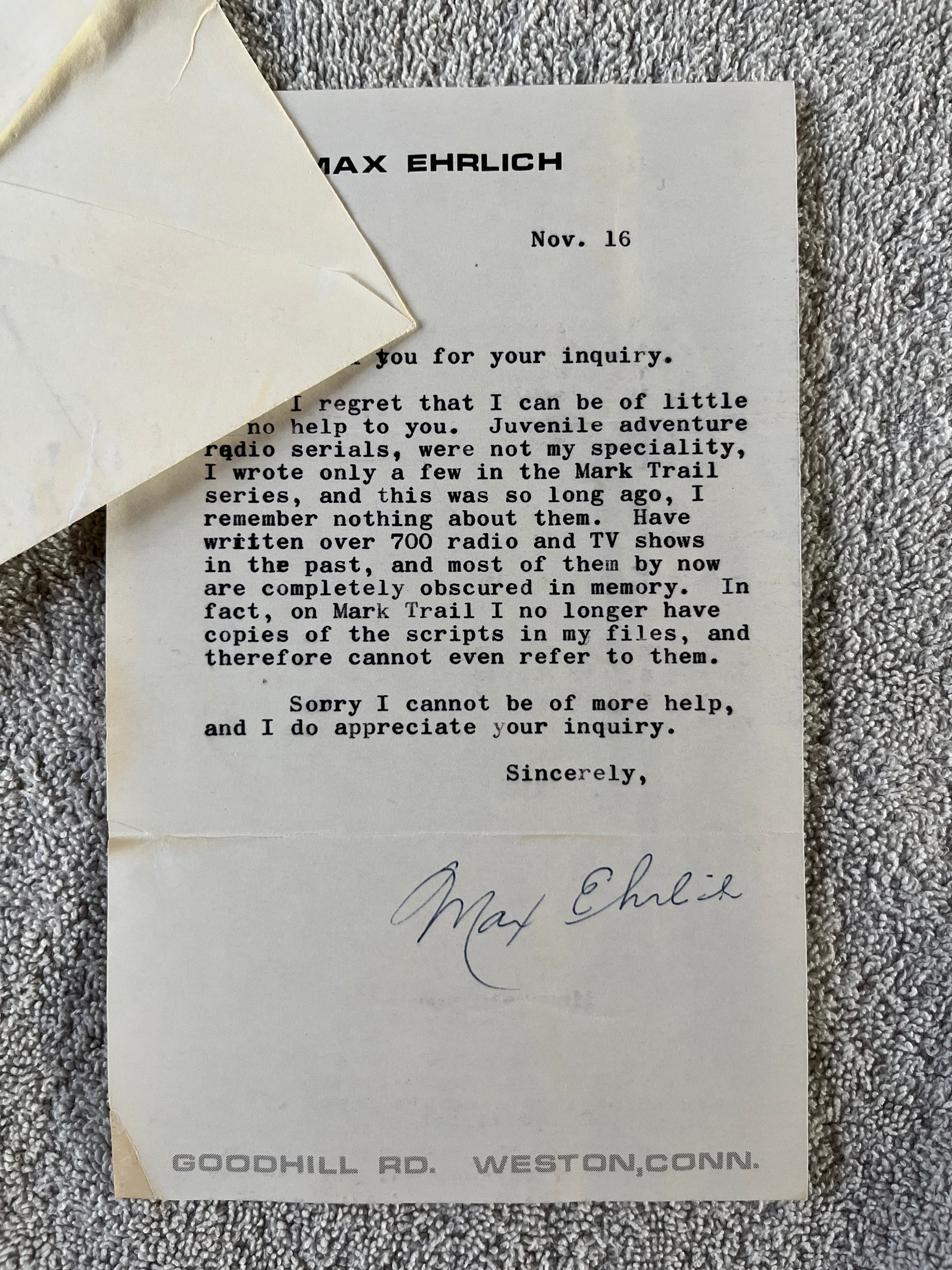 Max Ehrlich was a script writer for numerous radio programs including CRIME DOCTOR, THE SHADOW and MURDER AT MIDNIGHT. He later wrote for motion-pictures and television programs including STAR TREK, THE UNTOUCHABLES, THE GLASS KEY, VOYAGE TO THE BOTTOM OF THE SEA and more. Finding a legit autograph from Ehrlich is difficult but here is your chance to own one.
